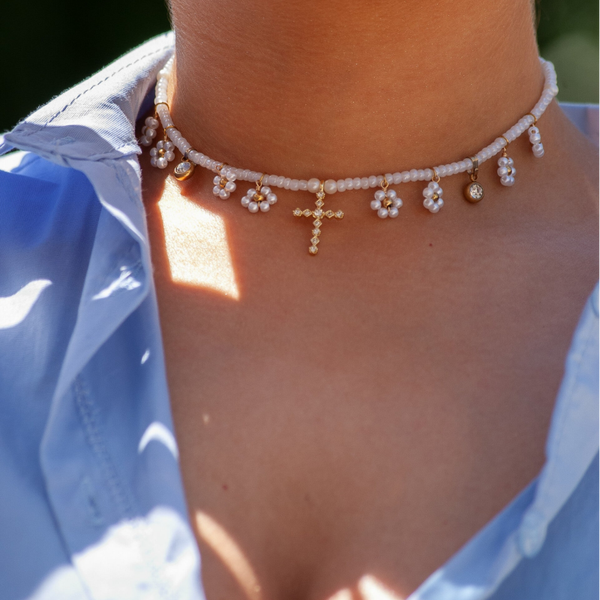 Ce collier ras de cou est composé de perles de rocailles blanches nacrées, de pendentifs et fermoir en acier inoxydable.